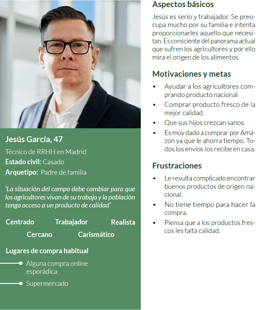 Jesús (55 años) Padre de familia. Quiere dar lo mejor a los suyos. Le preocupa el origen de lo que consume. Tiene poco tiempo y mucha responsabilidad.