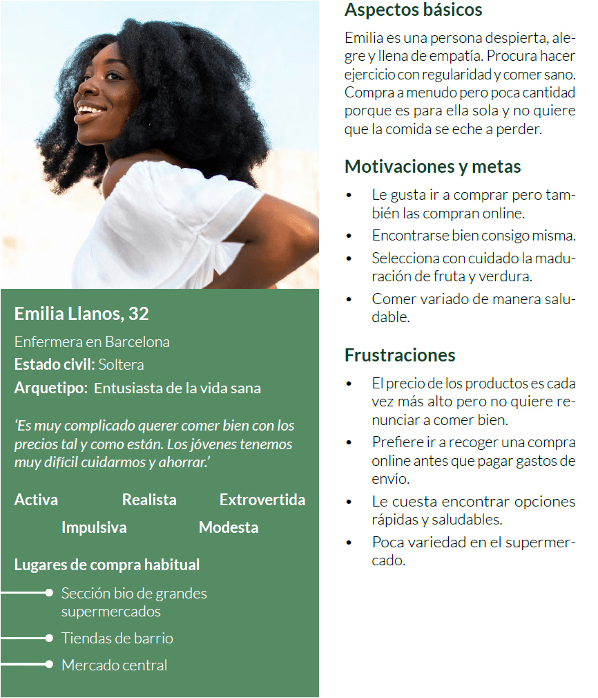 Emilia (32 años) Vive sola en Barcelona. Le encanta comer saludable, pero odia tirar comida. Está dispuesta a probar algo nuevo, siempre que tenga sentido práctico y económico.