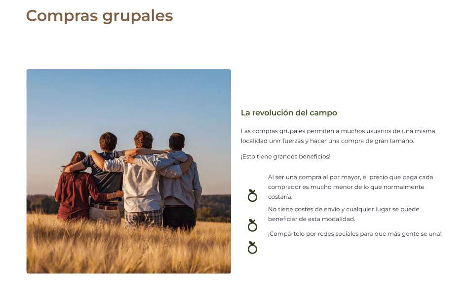 Área de compras grupales para asociaciones y familias.